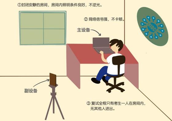 复试时需要1台主设备和1台副设备,设备可以用手机、平板或电脑。主设备用于近距离视频复试,副设备用于监控复试场所。