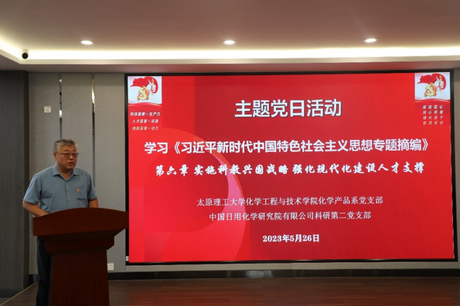 为深入贯彻落实党的二十大精神及习近平新时代中国特色社会主义思想,推动基层党组织建设工作走深走实,推进产学研深度融合与日化院高质量发展,院党委决定以共建促党建,实现党组织资源共享,优势互补,不断增强党组织的凝聚力、创造力和战斗力。5月26日,中国日化院科研第二党支部与太原理工大学化学工程与技术学院化学产品系党支部共同召开支部共建启动会,并开展“支部共建 资源共享 优势互补 党业融合”主题活动。