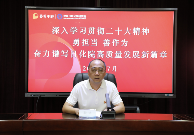 会上,党委书记、院长耿涛以《深入学习贯彻二十大精神 勇担当 善作为 谱写日化院高质量发展新篇章》为题,生动讲授了主题党课。党课结合二十大报告及习近平总书记关于担当作为的重要指示批示精神,讲述了中国共产党人担当作为的革命历史和政治品格,同时联系日化院实际,深刻阐述了什么是担当作为、为什么要担当作为、如何担当作为之间的关系。耿涛书记强调,党员干部要甘于担责、乐于担事、勇于担错、善于担难、敢于担险,培养担当的勇气和能力。他指出,新时代新征程,党员干部要做到信念过硬、责任过硬、能力过硬、作风过硬、立足新时代,完成新使命。他号召全体党员干部要在上半年取得超额完成预算目标好成绩的基础上,继续担当作为,脚踏实地、埋头苦干,把思想和行动统一到党的二十大精神和习近平总书记重要指示批示精神上来,心往一处想,劲往一处使,为完成全年任务目标,建设具有一流核心竞争力的科研院所努力奋斗。