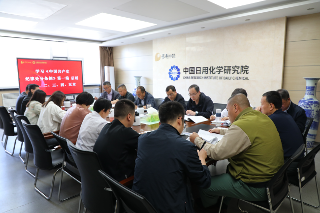 4月30日,中国日化院召开党委理论学习中心组学习(扩大)会,深入学习贯彻习近平总书记关于党纪学习教育的重要讲话和重要指示精神,全面落实中央和上级党委的部署要求,扎实开展党纪学习教育,为推动新时代日化院高质量发展提供坚强纪律保证。会议由中国日化院党委书记、总经理耿涛主持,班子成员和部门主要负责人参加。