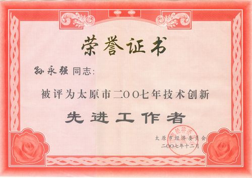 中国日化院孙永强、耿涛同志获2007年度太原市企业技术创新工作先进工作者光荣称号