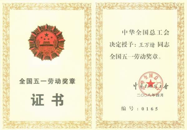 王万绪院长荣获全国“五一”劳动奖章荣誉称号