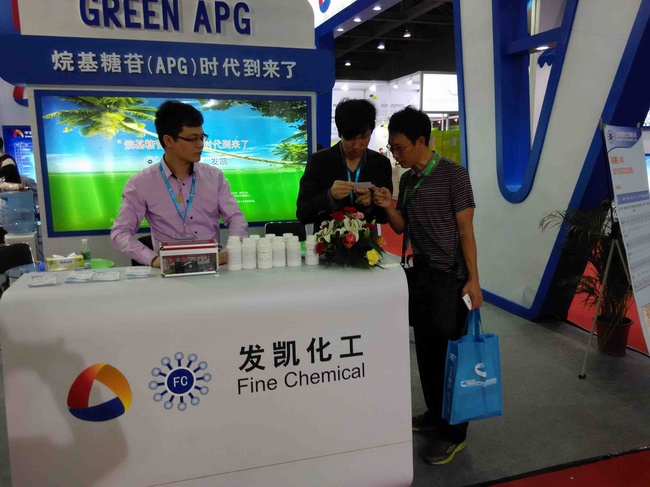 作为国内规模最大、品种最优的APG制造商,上海发凯“绿色 环保 安全”的品牌形象赢得了与会来宾的一致认可。近年来,企业致力于充分发挥技术优势,不断加强产品研发,扩大应用领域,以其高“性价比”优势,逐步提升国内外市场占有率。而中轻日化作为国内最大的新型非离子表面活性剂产业化示范基地参加此次展会,公司发展和新产品推广也备受业界关注。企业展台背景重点突出了公司主打新产品——脂肪酸甲酯乙氧基化物(FMEE)和改性油脂乙氧基化物(SOE),吸引了众多国内外宾客驻足关注、了解。