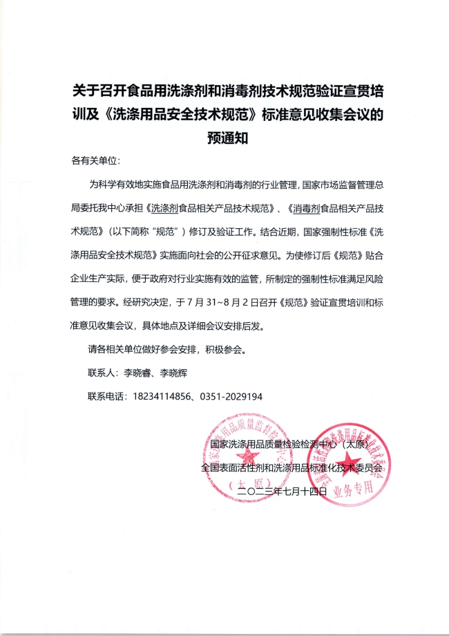 关于召开食品用洗涤剂和消毒剂技术规范验证宣贯培训及《洗涤用品安全技术规范》标准意见收集会议的预通知
