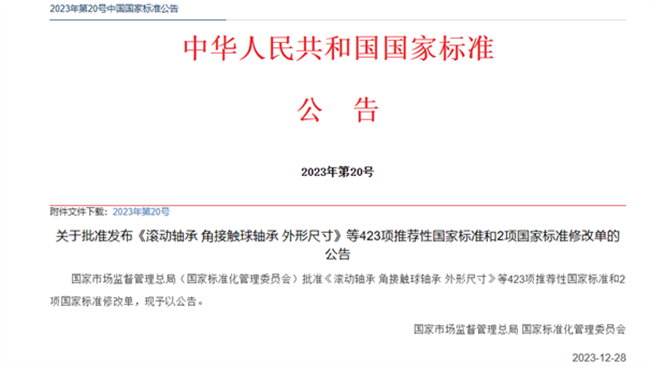 近日,国家市场监督管理总局(国家标准化管理委员会)发布《关于批准发布<滚动轴承 角接触球轴承 外形尺寸>等423项推荐性国家标准和2项国家标准修改单的公告》(2023年第20号)。