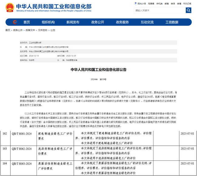 三项标准将于2025年7月1日起实施。日化领域绿色工厂标准的发布健全了表面活性剂和洗涤用品标准体系,为日化领域绿色产业升级提供了技术支撑。