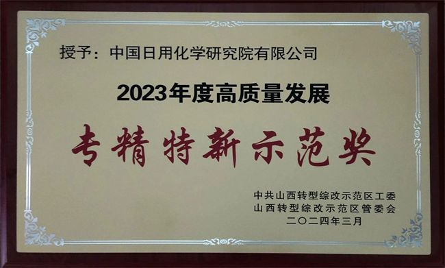 3月11日,中国日化院被中共山西转型综改示范区工委和山西转型综改示范区管委会联合授予2023年度高质量发展专精特新示范奖。这是继获批国家级专精特新“小巨人”企业,顺利通过国家级高新技术企业复审后,日化院获得的又一科技创新类荣誉。