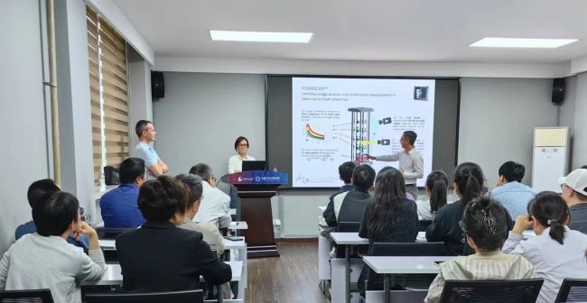 Peggy LECHEVALIE女士主要介绍了FOAMSCAN泡沫仪的结构和数据分析功能。JEAN LUC博士介绍了FOAMSCAN泡沫仪在日化产品如沐浴露、牙膏、洗面奶等研发中的应用。双方人员就液体泡沫理论进行了交流,同时就实验过程中遇到的问题进行了探讨。