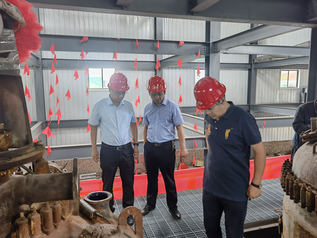 在施工现场,耿涛院长仔细询问施工的前期工作情况,工程施工进度、施工安全及施工难点等相关事宜。杨效益副院长介绍了项目设备定制加工,项目工艺流程、环保问题及建成后的产能情况。陈礼刚经理介绍了施工单位严抓工程质量及安全管理,认真落实安全施工责任制,遵守施工安全规章制度,增强工作的责任感等方面工作。耿涛院长听取介绍后要求项目负责人切实做好安全教育,确保安全施工,对工程建设完成后的产能及产品质量寄予厚望。
