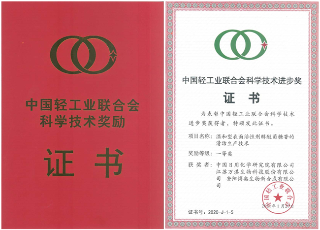 2021年7月18日中国轻工业联合会对2020年度中国轻工业联合会科学技术发明奖、进步奖等奖项获得者进行了表彰。中国日化院“温和型表面活性剂醇醚葡糖苷的清洁生产技术”获科学技术进步一等奖,“ISO 16560:2015 表面活性剂——聚乙氧基化非离子表面活性剂中聚乙二醇含量的测定——HPLC法”获科学技术进步二等奖。充分体现出日化院在表面活性剂领域的科研技术优势,彰显了日化院全链条创新实力和行业领先地位。