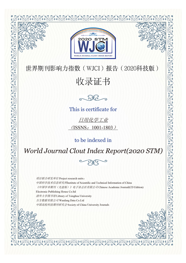 经严格评议,目前《WJCI报告》共收录全球科技期刊14287种,其中收录中国科技期刊1426种,覆盖246个学科。《日用化学工业》被收录于“化学工业一般性问题”学科,本学科共收录全球期刊42种,其中中国大陆期刊仅收录6种,《日用化学工业》位列收录中国大陆期刊的第4位。入选《WJCI报告》的期刊均被认为是具有地区代表性和学科代表性的优秀期刊,这对提升期刊的学术影响力和国际传播力具有重要意义。