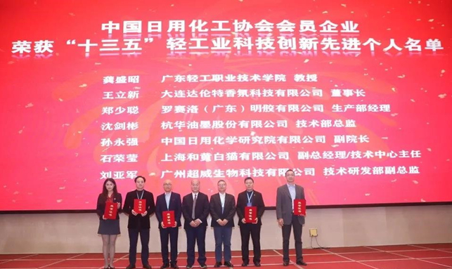 2021中国日用化工行业年会以“谋划布局促发展、创新引领谱新章”为会议主题,中国日化院院长耿涛向大会致词并担任颁奖嘉宾。孙永强副院长荣获中国日用化工协会颁发的“‘十三五’轻工业科技创新先进个人”荣誉证书。在会议现场,我院的企业形象及生产的日用化工原料和产品进行了背景板展示和展架陈列。
