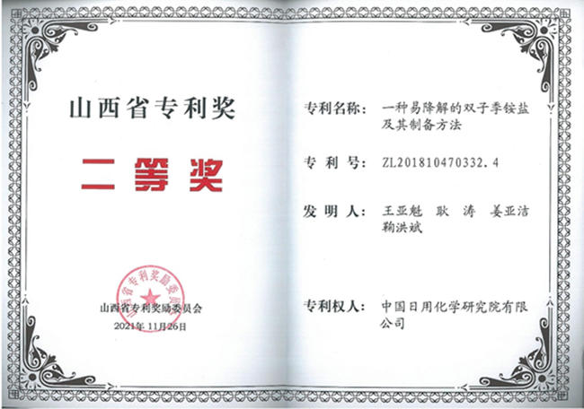 2021年11月26日,山西省专利奖励委员会对2021年度第三届山西省专利奖获得者进行了表彰,中国日化院“一种易降解的双子季铵盐及其制备方法”(国家发明专利,专利号ZL201810470332.4)喜获山西省专利奖二等奖,充分彰显了日化院在促进技术创新和构筑自主知识产权体系的核心优势。