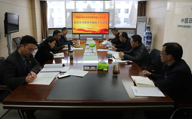 2月17日,中国日用化学研究院有限公司党委召开党史学习教育专题民主生活会。会议由党委书记、总经理耿涛主持,党委委员副总经理程宁、孙永强、杨效益和党委委员纪委书记张小旦参加了本次民主生活会,总经理助理尤劲钧、罗毅和纪检监察部主任王俊伟列席了本次民主生活会。
