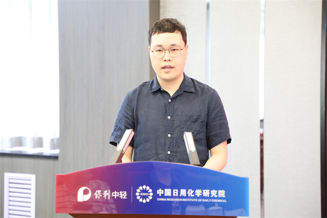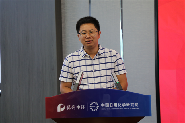 苏州维美生物科技有限公司总经理助理陈涛发表讲话,他肯定了中国日化院作为唯一的国家级科研院所对行业所做的贡献,介绍了苏州维美公司在氨基酸表面活性剂方面所做的工作及取得的成绩,表达了对“维美”奖学金获得者的热烈祝贺,并为对全体同学送上了美好祝愿,希望他们在学习和科研中再接再厉,奋勇争先,实现远大抱负,成就非凡梦想。