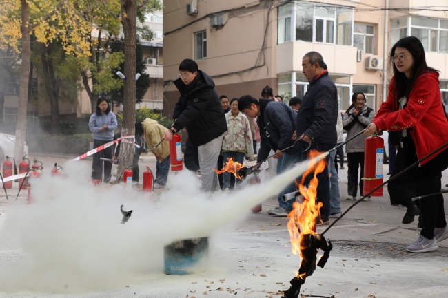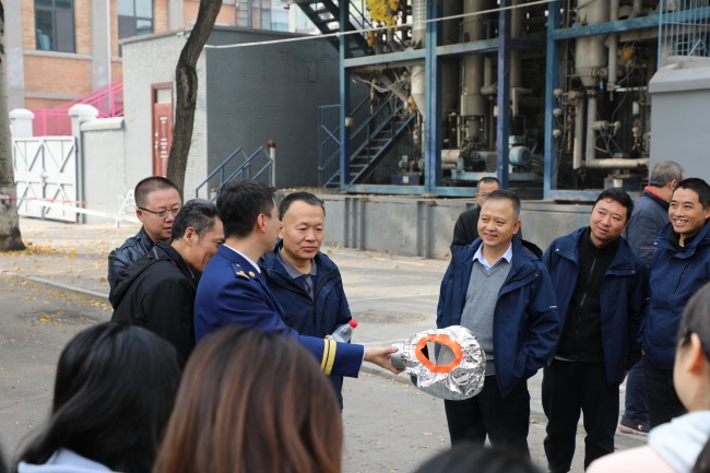 演练现场,消防专家对过滤式防毒面具、消火栓、干粉和二氧化碳灭火器的使用进行示范指导,进一步提升了参训人员的消防设备使用技能。