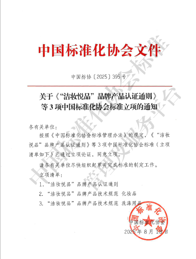 近日,中国标准化协会发布了《关于〈“洁妆悦品”品牌产品认证通则〉等 3 项中国标准化协会标准立项的通知》(中国标协〔2025〕395号),“洁妆悦品”3项标准的正式立项,标志着行业规范化发展迈出关键一步。这一成果是经过严谨论证流程形成的专业共识,为后续标准落地奠定了坚实基础。