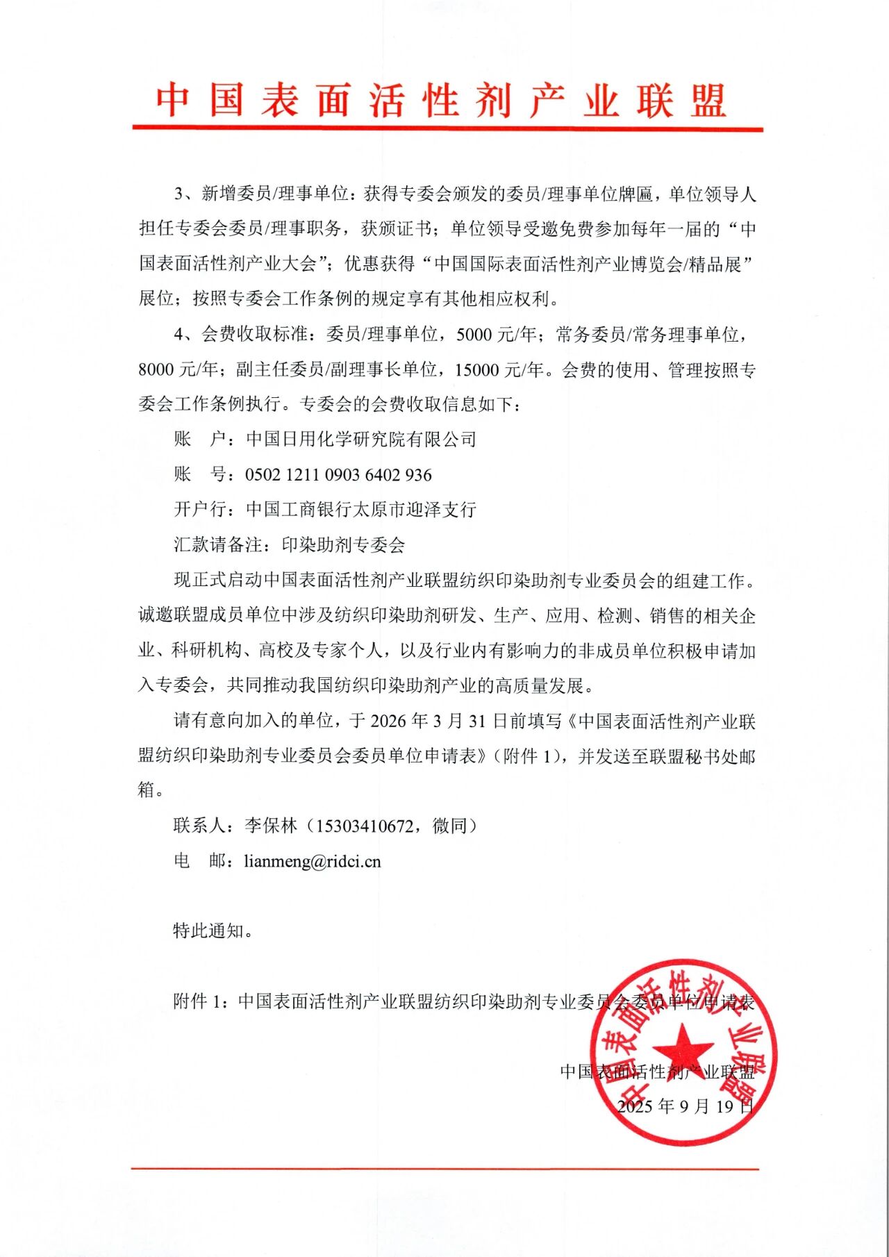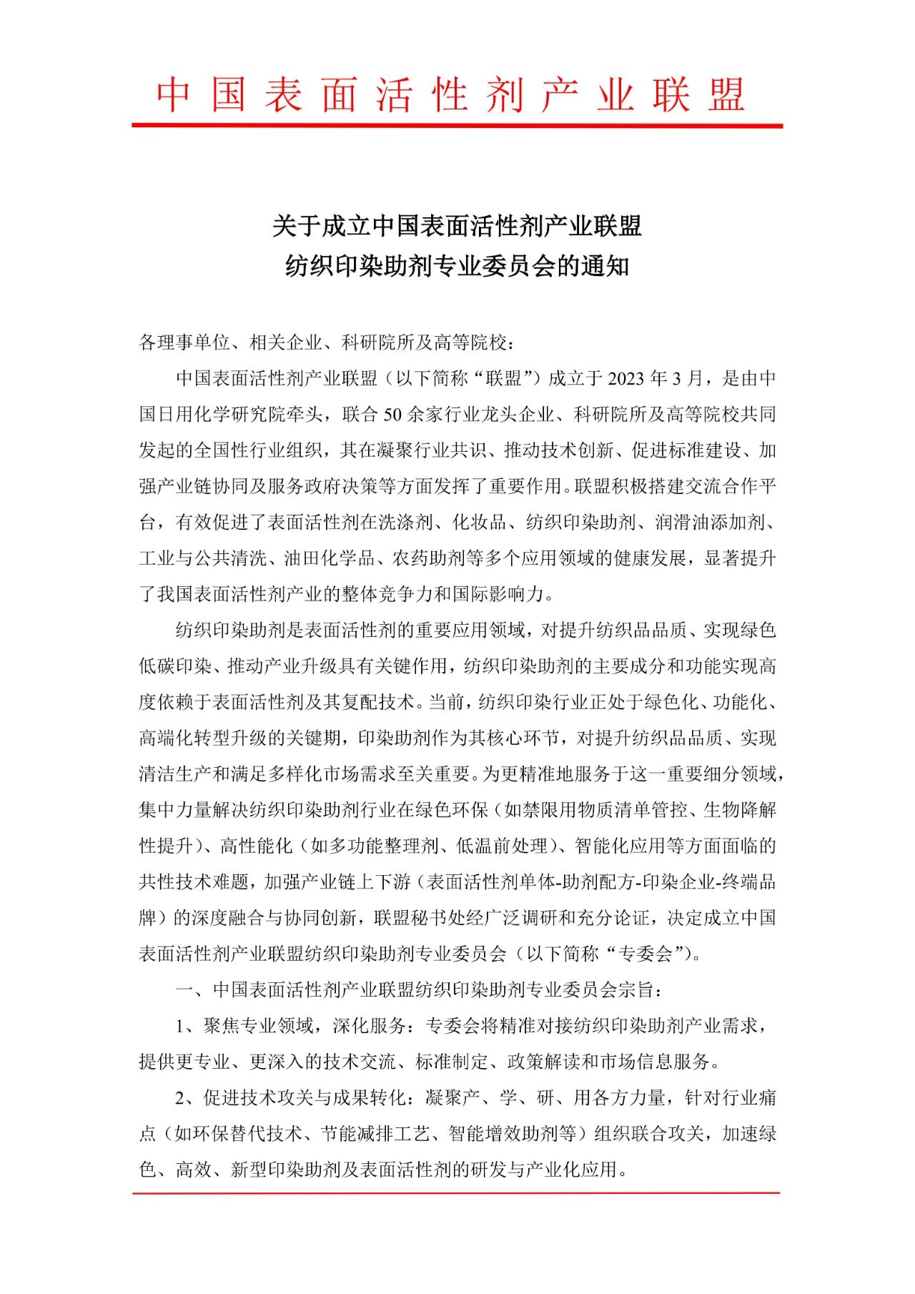 关于成立中国表面活性剂产业联盟纺织印染助剂专业委员会的通知
