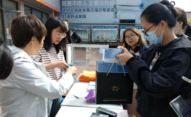 社区居民在工作人员组织下试用中国日化院自主品牌“皙肽”修护嫩肤和焕颜靓肤系列个人护理产品,感受植物精华萃取物、深海提取物和小分子水解肽为肌肤带来的柔嫩护肤效果。