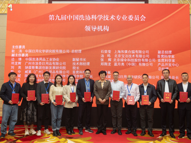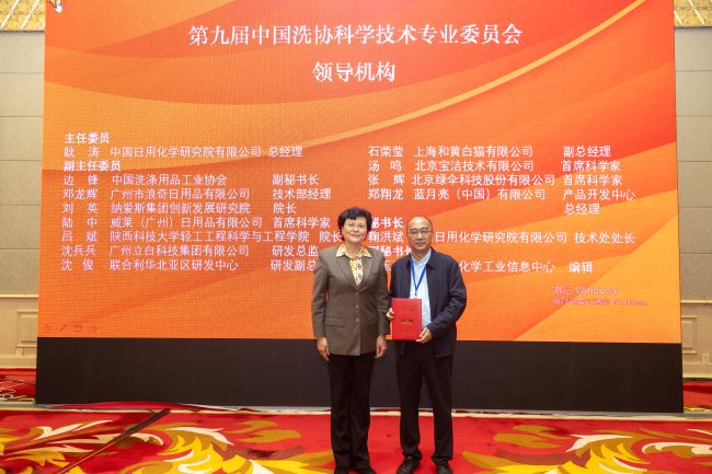 中国日用化学研究院院长耿涛向当选的第九届表委会副主任委员、秘书长、副秘书长颁发证书